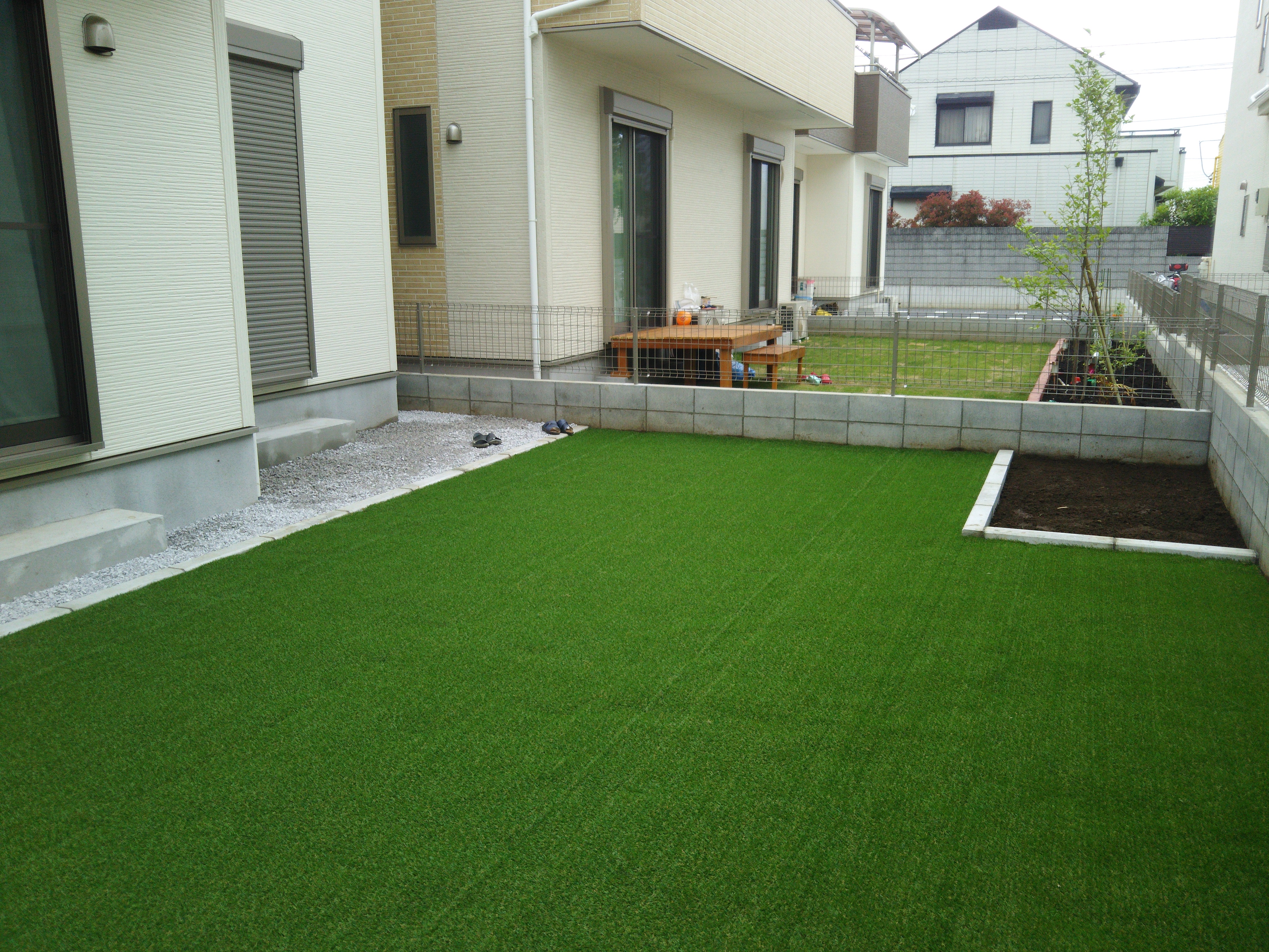 人工芝と砂利の境界、花壇に地先ブロックを入れて施工しました。広さは50㎡程です。